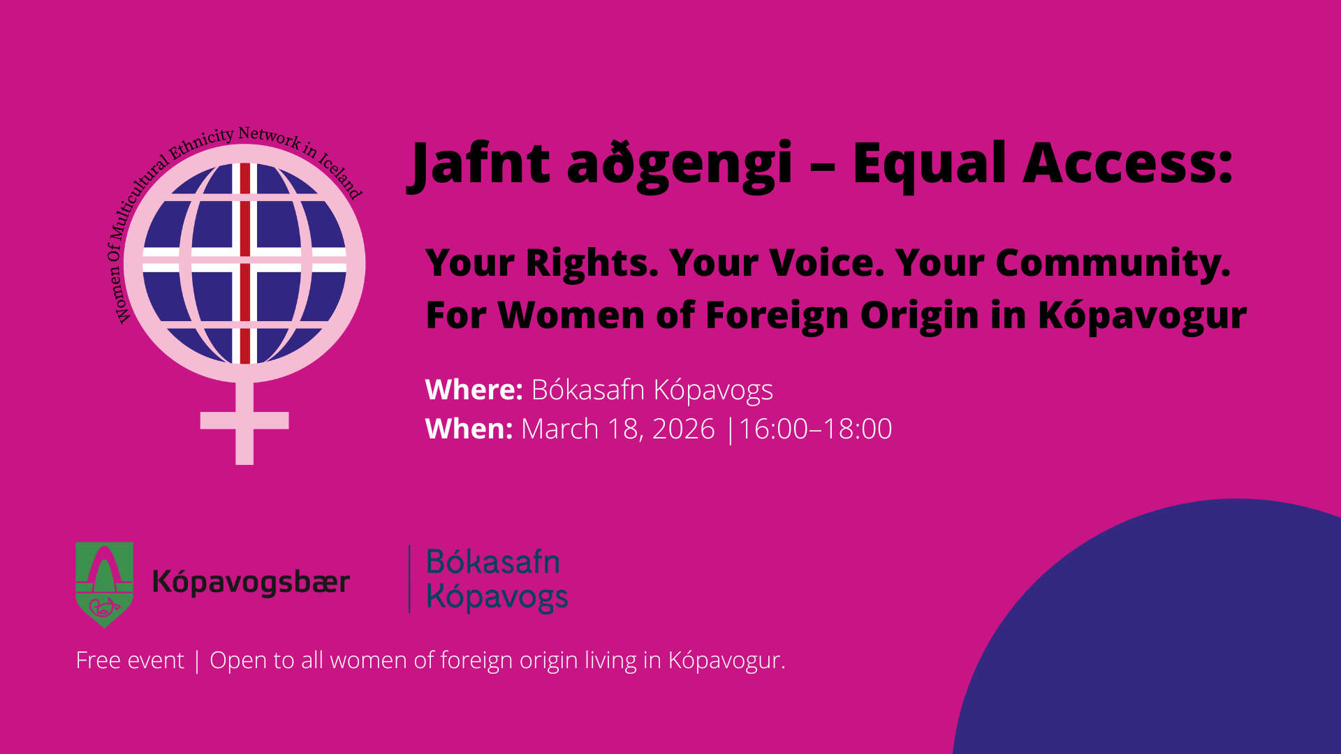 “Jafnt aðgengi” (“Equal Access”) is a new project by W.O.M.E.N. in Iceland, created by women for women, to strengthen knowledge, participation, and equality among women living in Kópavogur.