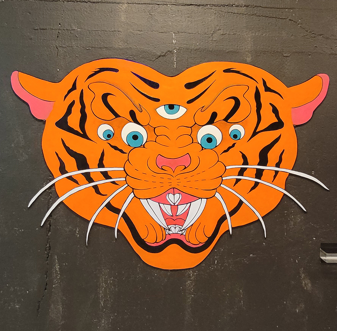 „Tigeryaki“ er verk sem sameinar hefðbundin útskorin form og akrýlmálun við nýstárlega tækni sem notuð er við endurkortlagningar og vörpun. Verkið táknar andlegan verndara sem vakir yfir og leiðir einstaklinga í gegnum líf þeirra. Mynstur sem eru á stöðugri hreyfingu tákna líf okkar, síbreytilegt en engu að síður fallegt á sinn hátt. „Tigeryaki“ er uppspretta styrks, hugrekkis og fullvissu, sem veitir huggun á tímum óvissu og minnir áhorfendur á eðlislægan styrk þeirra og kraft.